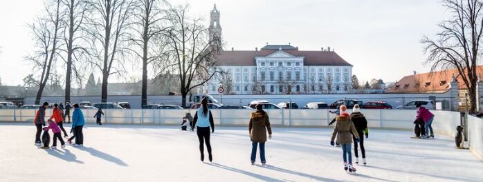 An der frischen Luft genießen Familien das Gleiten über den 900 m² großen Kunsteislaufplatz.
