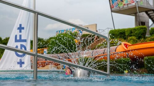 Ein Erlebnisbecken mit Breit- und Längsrutsche, einen Strömungskanal, Kletternetz und Bodenblubber.