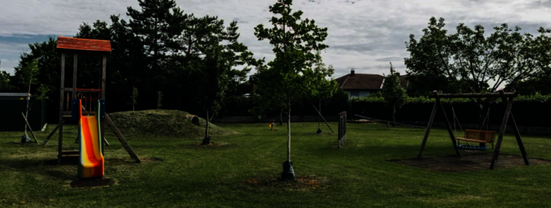 Ein großzügiger, ruhiger Spielplatz mit viel Grünfläche, schattenspendenden Bäumen, Rutsche und Schaukeln. Ideal für Kinder zum sicheren Spielen, Toben und Entspannen im Freien. Ein Zaun rund um den Spielplatz sorgt für zusätzliche Sicherheit und gibt Eltern ein beruhigendes Gefühl.