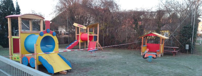 Der eingezäunte Spielplatz bietet vielseitige Spielmöglichkeiten für Kinder unterschiedlicher Altersgruppen. Highlights sind Schaukeln inklusive Nestschaukel, Rutschen, Kletter- und Balancierelemente sowie Spielgeräte für kleinere Kinder. Sitzgelegenheiten und viel Grün rundherum machen den Spielplatz zu einem angenehmen Ort für Spiel, Bewegung und eine entspannte Pause mit der Familie.