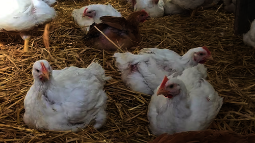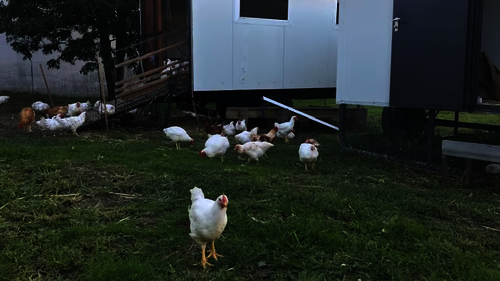 Unsere Hendln bekommen wir als Tagesküken. Die erste Zeit benötigen sie 30-32 Grad Raumtemperatur, erst ab ca. 3 Wochen kommen sie in einen großen Stall und wenn es die Witterung zulässt, nutzen die Hendln ab der 4. Lebenswoche unser Freigelände bzw. einen fahrbaren Hendlstall, den wir selbst gebaut haben. Um sie vor Marder und Fuchs zu schützen, werden sie in der Nacht immer in den Stall geholt. Die Hendln leben bei uns zwischen 8 und 13 Wochen, bis wir sie im hauseigenen Schlachtraum ohne Stress schlachten und zum Verkauf verpacken.