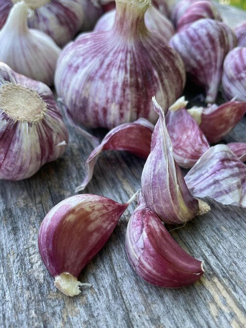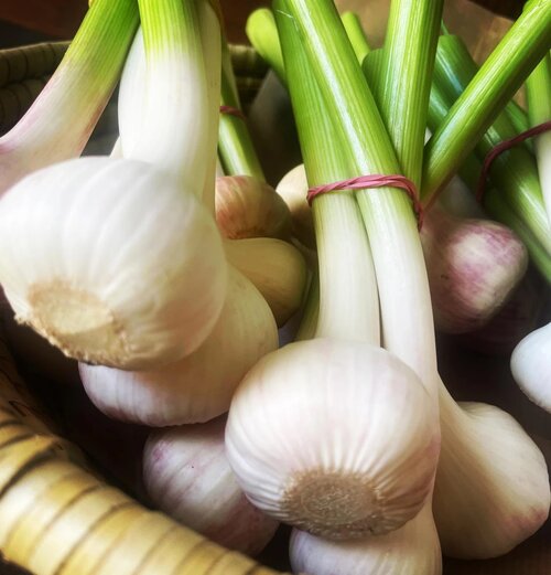 Der Knoblauch wird im Oktober gepflanzt. Anfang Juni ernten wir bereits würzigen Grünknoblauch. Die Erntesaison der Lagersorten beginnt im Juli. Danach wird der Knoblauch sonnengetrocknet und schonend von Hand "geputzt", dabei wird die äußerste Schale entfernt. Nach dem Sortieren und Verpacken ist der Knoblauch zum Verkauf bereit.