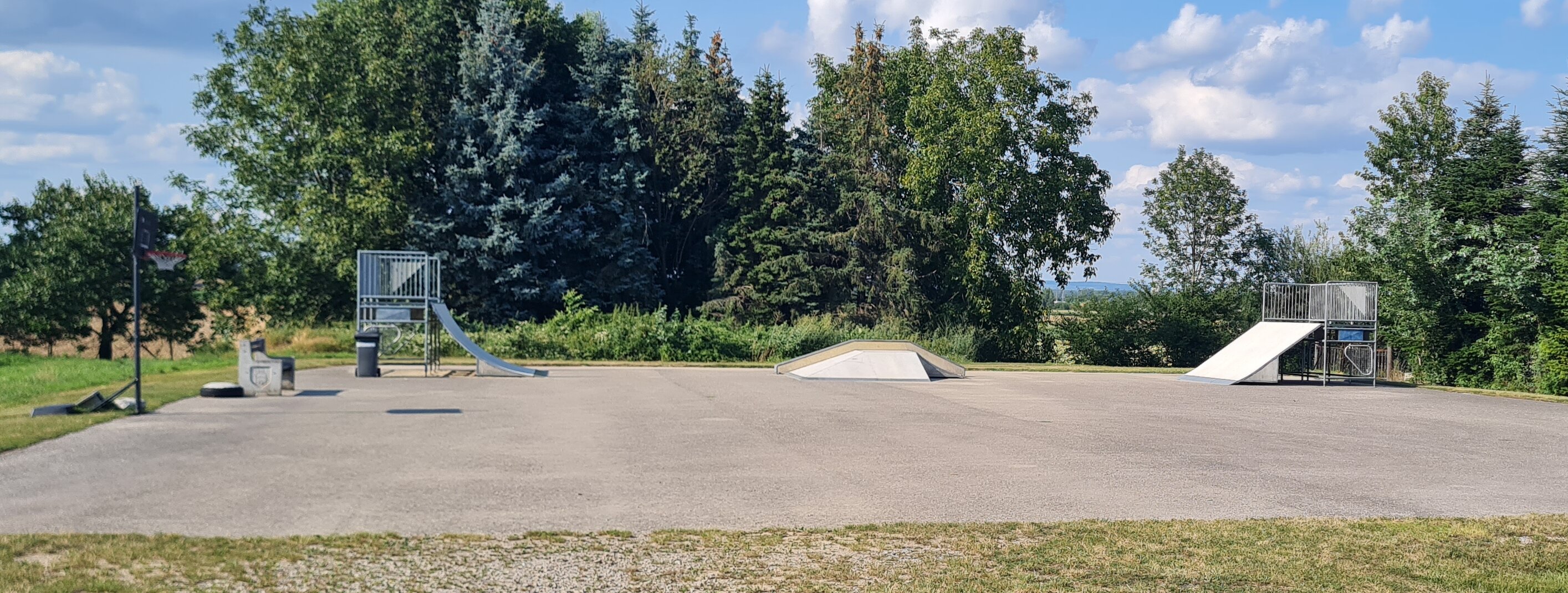 Die Skateanlage besteht aus einer befestigten, großzügigen Fahrfläche mit mehreren Skate-Elementen. Dazu gehören zwei erhöhte Rampen mit Plattformen und Geländern, eine zentrale Funbox mit flachen Auf- und Abfahrten sowie weitere Übergänge zum Üben von Tricks. Die Anlage ist offen gestaltet, von Grünflächen und Bäumen umgeben und bietet ausreichend Platz für Skater, Scooter- und BMX-Fahrer.